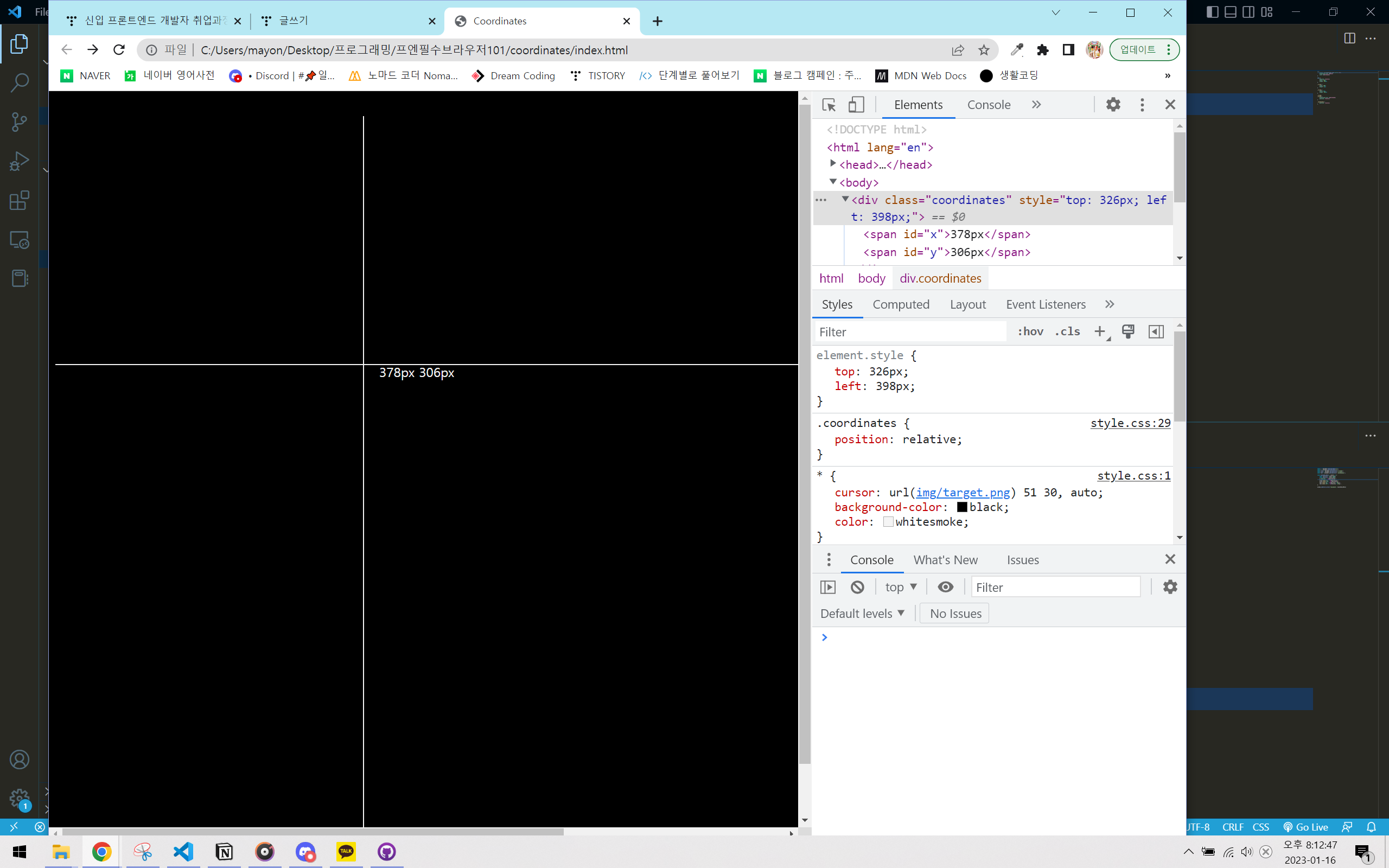 5. ๋ง์ฐ์ค์ ์์น ์ฝ๊ฐ ์๋(20px์ฉ) ์ text ์์น๋ฅผ ๋ฐ์์ํด.