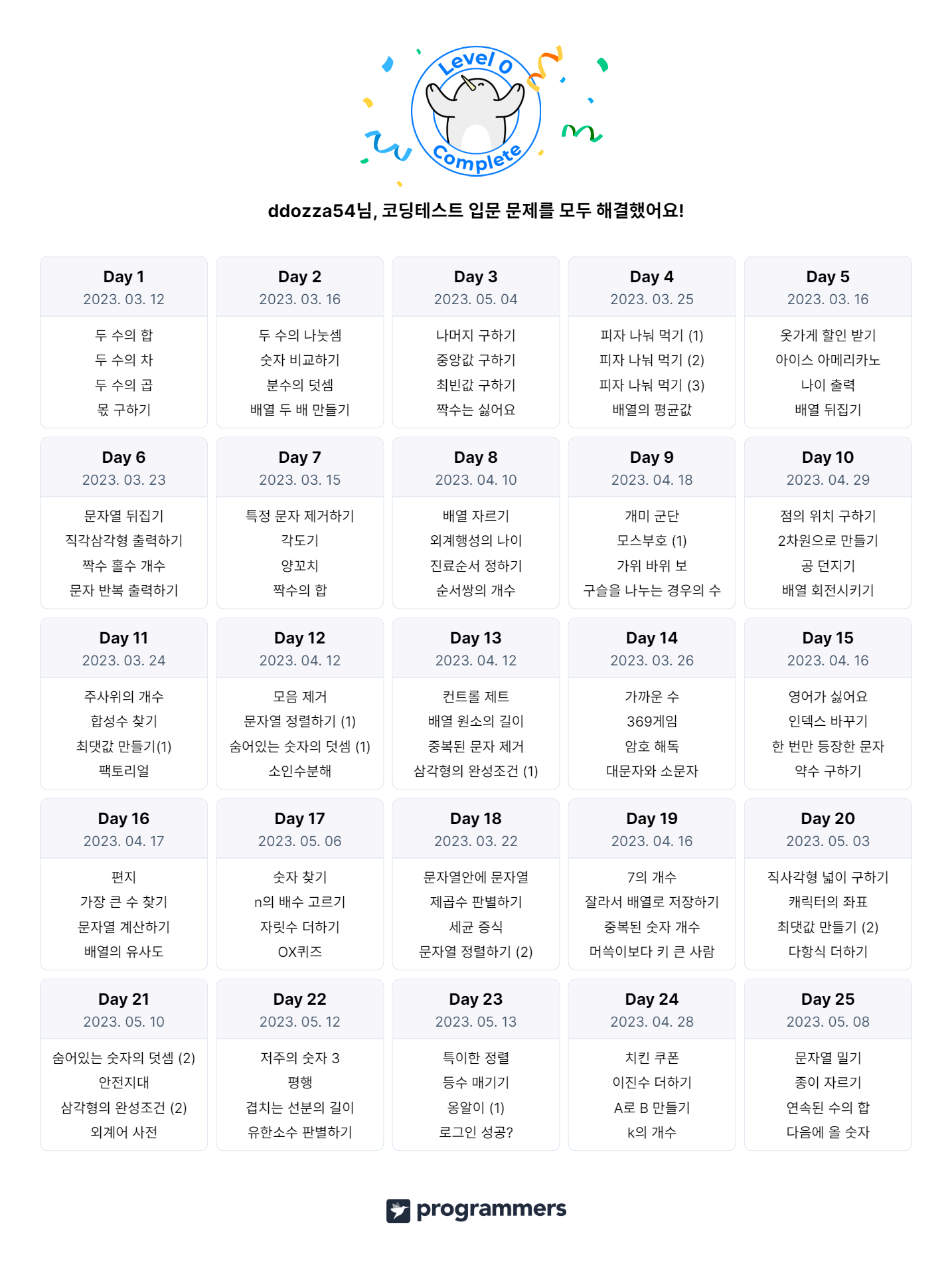 ๊ทธ๋ฆฌ๊ณ ๋๋์ด 0๋จ๊ณ 100๋ฌธ์ ๋ฅผ ๋ชจ๋ ํ์๋ค!!!