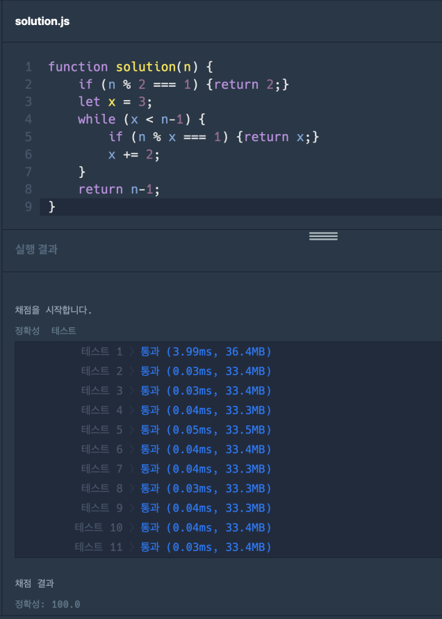 3 ≤ n ----> 3 % 2 === 1 -> return 23๋ณด๋ค ์์ ์์ฐ์ ์ค์์ ๋ฌธ์ ์ ์กฐ๊ฑด์ ๋ง์กฑํ๋ ์๊ฐ ์์ผ๋ฏ๋ก, 3์ return ํด์ผ ํฉ๋๋ค. ์ง์(4, 10) % 3 === 1 --> return 3๋ถํฐ ์์12๋ฅผ 11๋ก ๋๋ ๋๋จธ์ง๊ฐ 1์ด๊ณ , 11๋ณด๋ค ์์ ์์ฐ์ ์ค์์ ๋ฌธ์ ์ ์กฐ๊ฑด์ ๋ง์กฑํ๋ ์๊ฐ ์์ผ๋ฏ๋ก ----> n % n-1 === 1