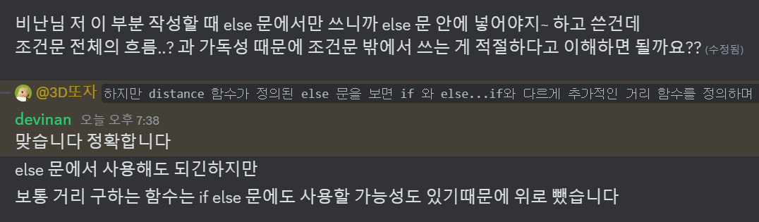 ํ์ง๋ง distance ํจ์๊ฐ ์ ์๋ else ๋ฌธ์ ๋ณด๋ฉด if ์ else...if์ ๋ค๋ฅด๊ฒ