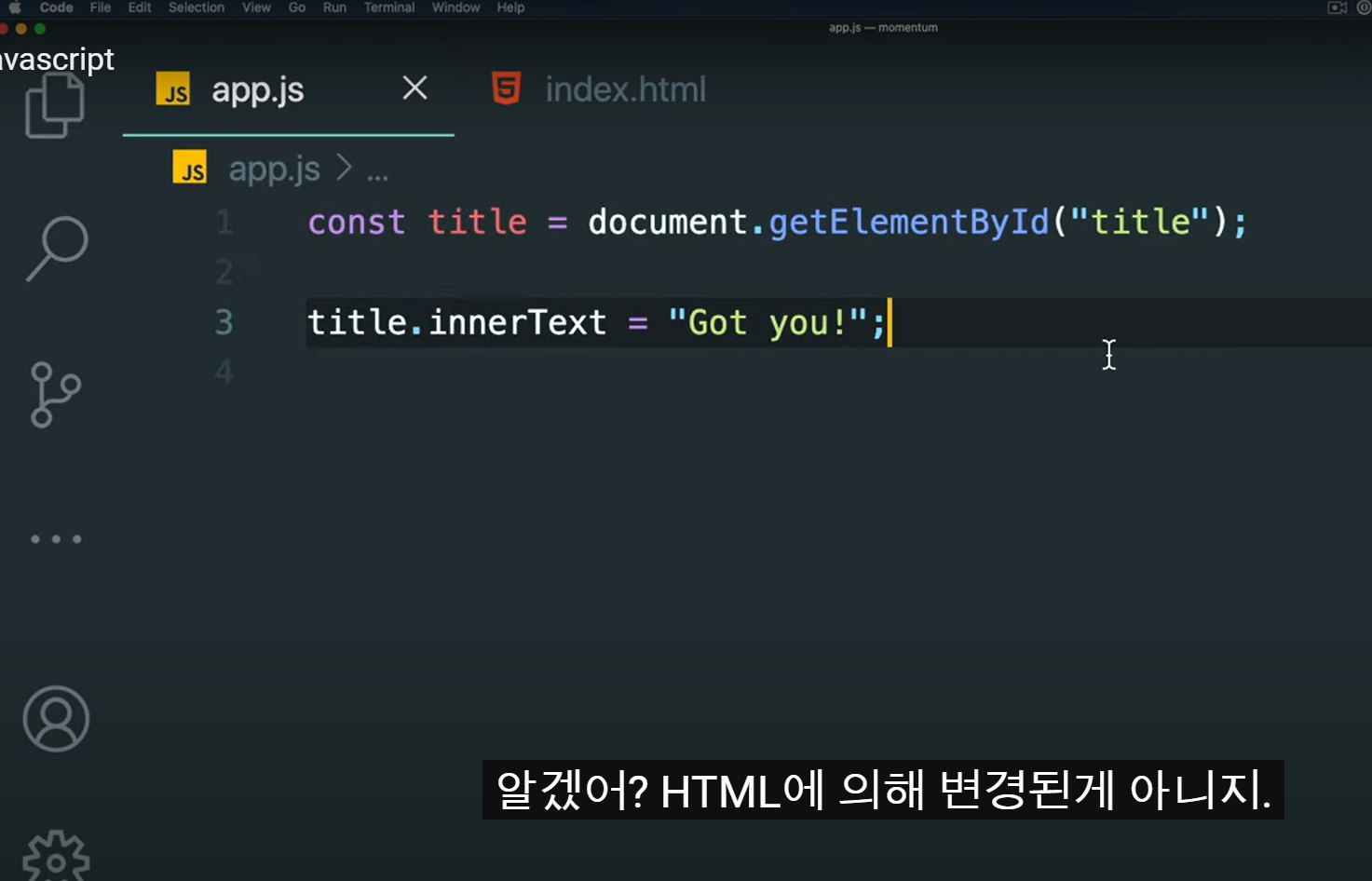 JS ํ์ผ์์ : ์ด element / title.innerText = "Got You!" ๋ฅผ ๊ฐ์ ธ์๊ธฐ ๋๋ฌธ.